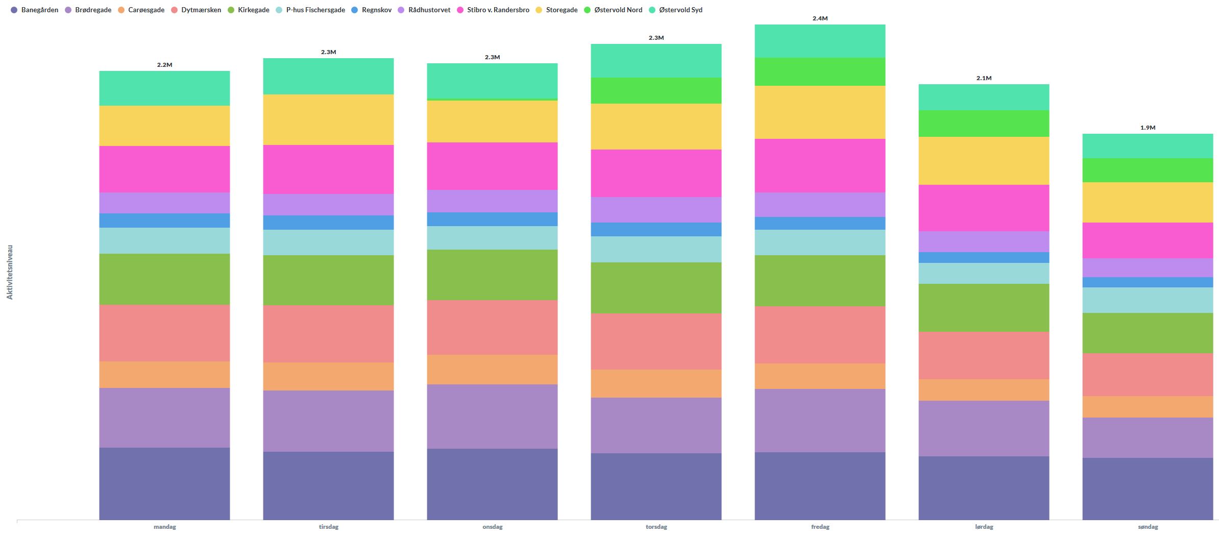 Viser aktivitetsniveauet i midtbyen fordelt på de enkelte dage i den forgangne uge. ”Aktivitetsniveauet” er et udtryk for det konstante antal personer i nærheden af et hotspot. Bemærk at der kun fanges ca. 30 % af den samlede aktivitet.