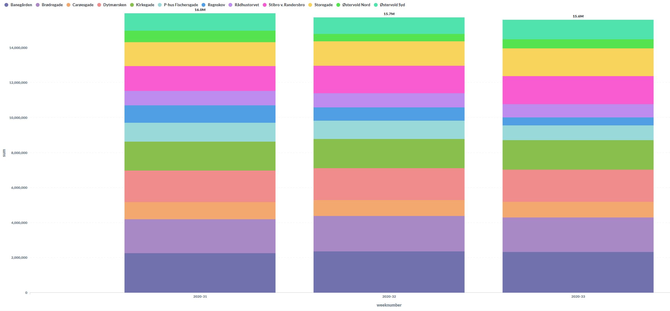 Viser aktivitetsniveauet for en række forskellige hotspots i midtbyen over de sidste 3 uger. ”Aktivitetsniveauet” er et udtryk for det konstante antal personer i nærheden af et hotspot. Bemærk at der kun fanges ca. 30 % af den samlede aktivitet.